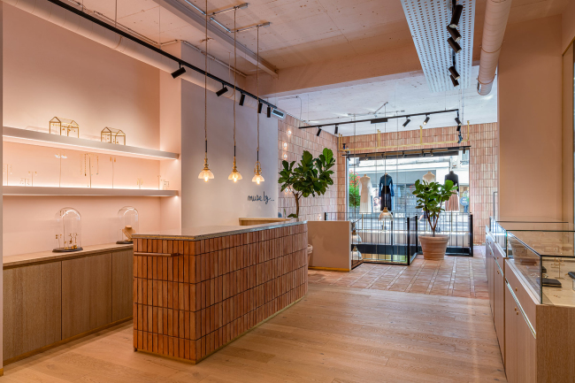 项目以高品质的材料为重点,以现场的情况为依据进行定制化设计,平衡了服饰的柔软触感和工业元素特有的冷硬感,从而创造出一个清新且极具感染力的室内空间。在材料的选择上,整个室内空间都采用手工制作的陶土砖,再辅以绿色的釉面砖、彩色的水磨石、华丽的地毯、木饰面和拉丝黄铜配件,营造出一个舒适的商业氛围。